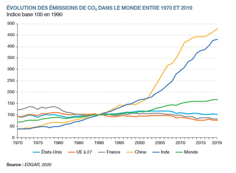 2. Il existe un lien entre les émissions de CO2 et le niveau de développement économique des pays, et les différences de développement qui existent entre les pays dans le monde représentent un obstacle à la mise en place d'une politique climatique internationale. Les pays développés en effet, comme ceux de l'UE ou les États-Unis, après avoir profité pendant longtemps d'un développement peu soucieux de l'environnement, ont maintenant stabilisé leurs émissions ( indice qui se 2.maintient à 100 en 2019 pour les États-Unis) mais restent de gros émetteurs. Alors que la Chine et l'Inde, en plein développement, voient leurs émissions augmenter fortement (les émissions de CO2 en Inde ont été multipliées par 4,3 sur la période). Dès lors comment répartir équitablement les coûts de la politique de réduction de ces émissions ? Diminuer les émissions reviendrait certainement à contraindre les possibilités de développement de ces pays, ce qui contribue à rendre plus complexes encore, les négociations internationales.