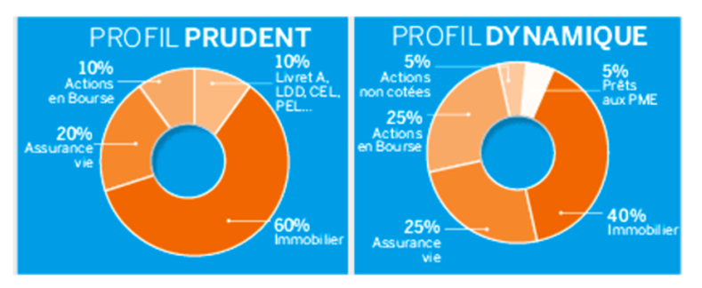 - l’arbitrage général est différent : La part de l’immobilier est réduite dans le profil dynamique au profit de l’assurance vie et des actions en bourse. Ici aussi, le profil dynamique présente donc plus de risque