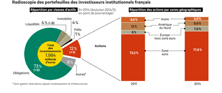 5/ La part des actions de la zone euro a progressé de 4,4 points entre 2011 et 2014 dans le portefeuille des investisseurs institutionnels.