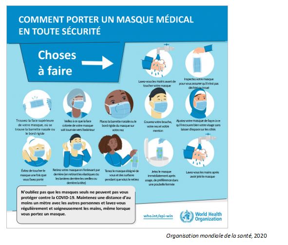 1/ L’OMS préconise les fameux gestes barrières : le port du masque, la distance sociale et le nettoyage des mains le plus régulièrement possible. Il s’agit de mesures de prévention