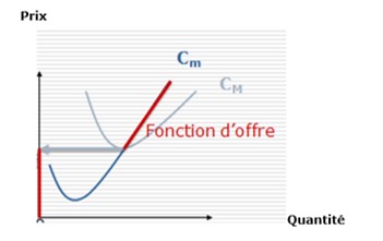Jusqu’au niveau de prix indiqué par une flèche, le producteur n’a pas intérêt à offrir le bien sur le marché puisque le prix ne couvre pas le coût unitaire. Au-delà de ce prix, l’offreur propose la quantité qui correspond à la courbe de coût marginal.