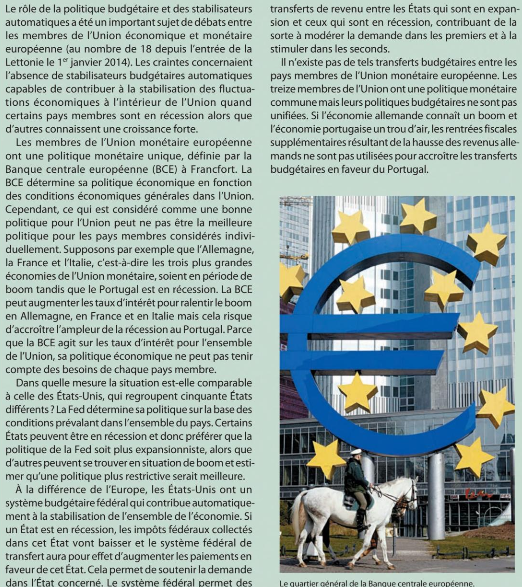 L’ensemble des Etats-Unis dispose de la même politique monétaire mais, contrairement à la zone euro, il y existe des mécanismes permettant de stabiliser la conjoncture automatiquement. Grâce à un système budgétaire fédéral, un Etat américain en récession contribuera moins au budget fédéral (il collectera moins d’impôts en raison de la baisse d’activité) et bénéficiera de transferts en provenance des Etats qui connaissent une expansion économique. Sa conjoncture sera ainsi stabilisée grâce au soutien de la demande dans cet Etat qu’une telle organisation permet dans ce cas. Un tel système n’existe pas dans la zone euro.