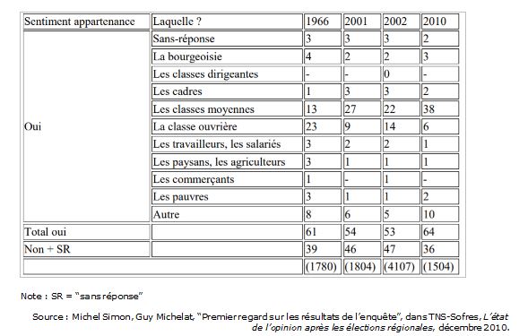 Le sentiment d’appartenance à la classe ouvrière a décru depuis 1966. Ainsi, en 1966, sur 100 individus interrogés, 23 en moyenne disent s’identifier à une classe sociale. En 2010, ils ne sont plus que 6 !