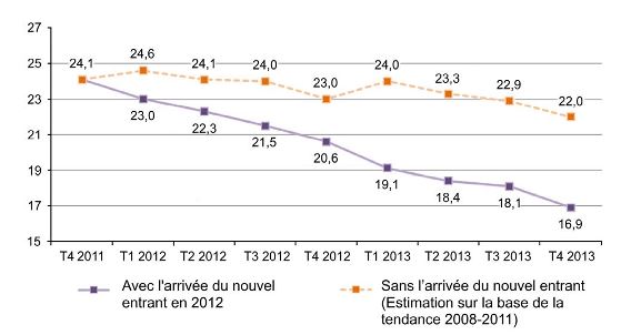I : D’après les données d’UFC Que choisir, au quatrième trimestre 2013, le montant mensuel moyen d’une facture de téléphonie mobile en France s’élèverait à 22€ sans l’arrivée du nouvel entrant contre seulement 16,9€ si le nouvel entrant était présent sur le marché. Cet écart s’explique par une baisse des prix qui résulterait d’une augmentation de la concurrence sur le marché de la téléphonie mobile. Du quatrième trimestre 2011 au quatrième trimestre 2013, l’arrivée d’un nouvel entrant sur le marché conduirait à une baisse du prix d’environ 30% (Taux de variation = (16,9- 24,1)/ 24,1 ) x 100= 29,87) contre seulement 9 % ( Taux de variation = (22- 24,1)/ 24,1 ) x 100= 8,71) sans l’arrivée du nouvel entrant.