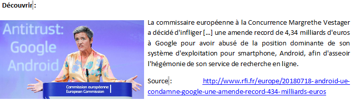 Source : Par L'Obs avec AFP, « Android: l'UE sanctionne à nouveau Google par une amende record », Publié le 18 juillet 2018 à 13h35, https://www.nouvelobs.com/topnews/20180718.AFP3866/android-l-ue-sanctionne-a-nouveau-google-par-une-amende-record.html