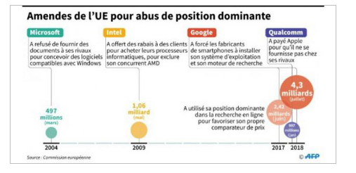 L'UE a sanctionné [… ] Google pour abus de position dominante avec une amende record de 4,34 milliards d'euros […]. Elle sanctionne l'entreprise américaine pour avoir abusé de la position dominante d'Android, son système gratuit d'exploitation pour smartphone, afin d'asseoir la suprématie de son service de recherche en ligne. […] Il y a un peu plus d'un an, le 27 juin 2017, l'entreprise avait été déjà condamnée par la Commission européenne à payer une amende de 2,42 milliards d'euros pour avoir abusé de sa position dominante dans la recherche en ligne en favorisant son comparateur de prix "Google Shopping", au détriment de services concurrents. Le montant de l'amende est décidé au dernier moment et peut atteindre théoriquement, selon les règles de la concurrence européenne, jusqu'à 10% du chiffre d'affaires global de l'entreprise qui s'élevait pour Alphabet, maison mère de Google, à 110,9 milliards de dollars en 2017 (94,7 milliards d'euros).