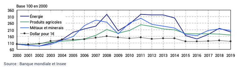 L’année 2019 se caractérise par une baisse des prix des matières premières. Après deux années de forte croissance (plus de 20% l’an), le prix du pétrole (cf. prix du Brent) diminue légèrement. L’indice des prix de l’énergie était d’environ 190 en 2019, base 100 en 200.
