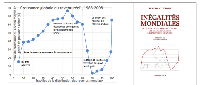 La courbe dite « de l’éléphant » permet de visualiser une redistribution des revenus à l’échelle mondiale. Elle offre une vision rapide et synthétique des « gagnants » (les 1% les plus riches de la planète et les nouvelles classes moyennes des pays émergents) et les « perdants » (classes moyennes des économies avancées) de la mondialisation. Pour Branco Milanovic, la situation des individus dépend d’abord et avant tout de l’endroit où ils sont nés !