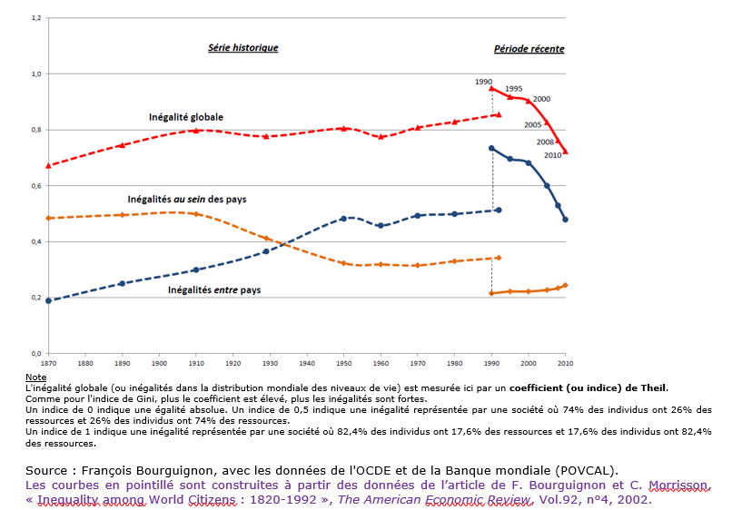 Ils démontrent d’abord que l’inégalité mondiale reste élevée. Mesurée avec l’indice de Gini du revenu mondial (qui va de 0 égalité parfaite à 1 inégalité parfaite), l’inégalité mondiale était supérieure à 0,7 en 2008. Elle est supérieure à celle mesurée à l’intérieur de chaque pays (en France, l’indice de Gini était de 0,289 en 2008). Toutefois, ils pointent un déclin de l’inégalité mondiale ! En effet, l’inégalité entre pays a diminué (cf. essor économique des pays du sud-est asiatique dont la Chine).