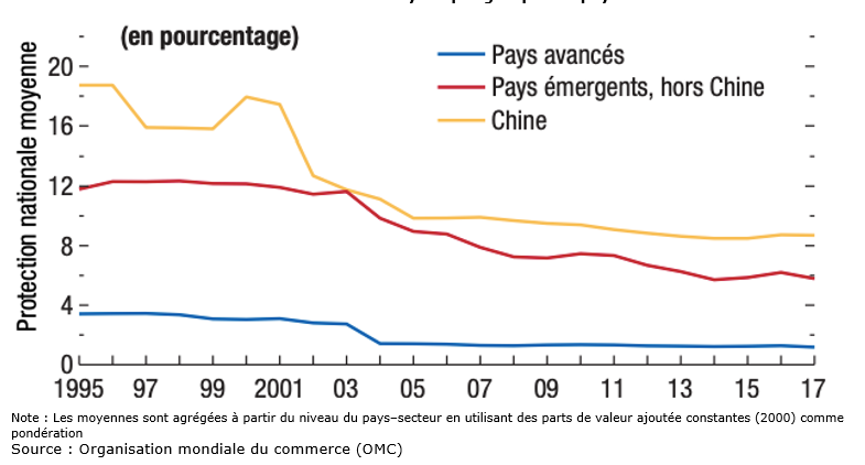 Étant donné le fractionnement des chaînes de valeur mondiales, les produits franchissent plusieurs fois les frontières avant d'atteindre le consommateur final. Les liens ainsi créés devraient a priori réduire les incitations des pays à se protéger. Néanmoins, les récentes mesures protectionnistes prises par les États-Unis, dans le but de rapatrier une partie de la chaîne de valeur sur leur sol, vont à l’encontre de cette tendance.