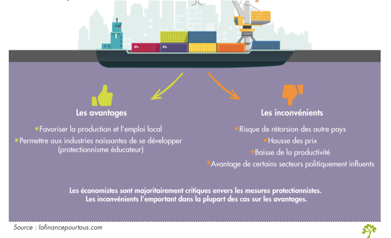 A l’inverse, le protectionnisme est une politique commerciale qui vise à instaurer ou augmenter les barrières tarifaires (droits de douane, taxes, etc.) et non tarifaires (quotas, contingentements, contraintes administratives, le respect de normes techniques et sanitaires ou des restrictions à l’accès au marché intérieur, etc.) afin de limiter les importations.