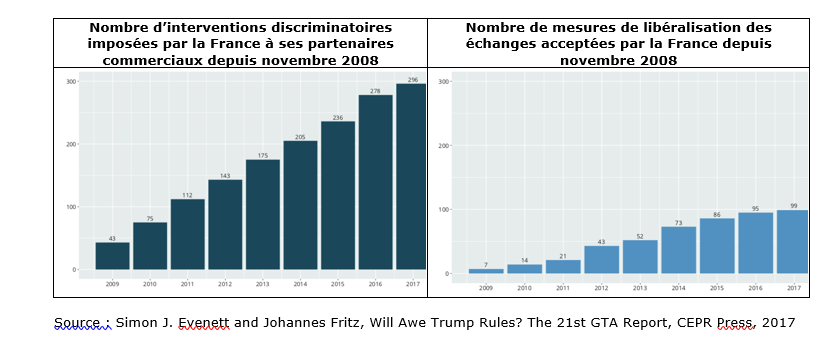 Simon J. Evenett and Johannes Fritz, la France a imposé 296 mesures discriminatoires en matière commerciale en 2017.