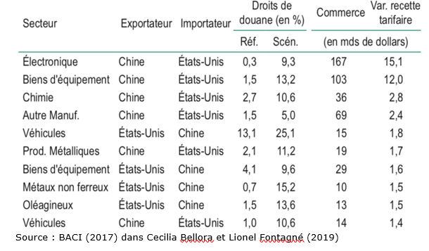 Selon Cecilia Bellora et Lionel Fontagné dans le secteur de l’électronique, les exportations de la Chine vers les États-Unis sont affectées d’un droit de douane de 0,3 % dans la situation de référence (Réf.). Avec les sanctions américaines, le droit de douane moyen dans ce secteur augmente de 9 points de pourcentage pour atteindre 9,3 % (Scén.). Ces nouveaux droits de douane s’appliquent à 167 milliards de dollars d’exportations chinoises de matériel électronique vers les États-Unis dans la situation de référence, soit un impact en termes de recettes tarifaires affectées de 15,1 milliards de dollars (167 milliards x 9/100 = 15,1 milliards de dollars).