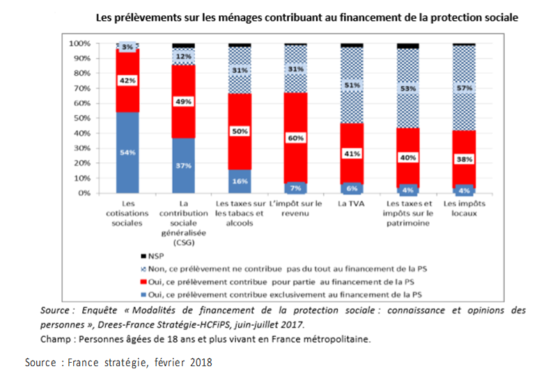 2/ Globalement, l’étude de France Stratégie montre que la connaissance qu’ont les personnes interrogées des prélèvements contribuant ou non au financement de la protection sociale est relativement correcte puisque la place essentielle des cotisations sociales est perçue par plus de la moitié des personnes interrogées. Rares sont les personnes interrogées qui ignorent le rôle des cotisations sociales et de la CSG. Mais, seules 54 % des personnes interrogées répondent que les cotisations sociales sont entièrement destinées à la protection sociale. Concernant les impôts, les erreurs de perception sont plus marquées : 60 % des personnes interrogées pensent que les impôts directs (sur le revenu, le patrimoine), indirects (comme la TVA) ou locaux financent la protection sociale, ce qui est faux. Enfin, la participation des taxes sur les tabacs et alcools au financement de la protection sociale est peu connue.