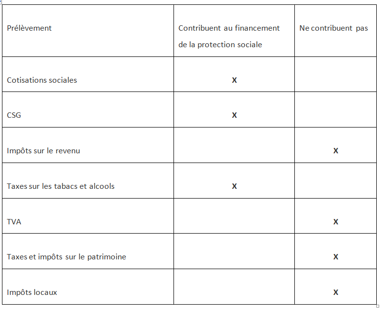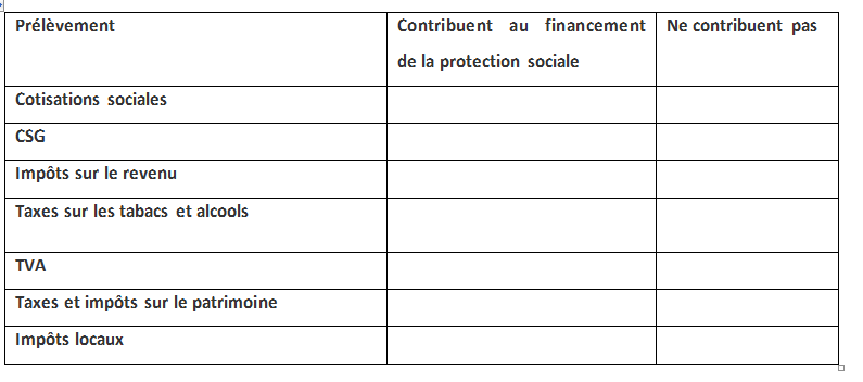 1 / Dans le tableau suivant, quels sont les prélèvements qui contribuent (ou pas) au financement de la protection sociale ? Cocher la case qui convient.