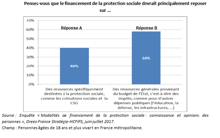 La réponse B correspond à la conception beveridgienne de la protection sociale, alors que la réponse A s’inscrit plutôt dans la logique dite « bismarckienne ». En effet, pour 58 % des personnes interrogées, la protection sociale doit être financée par l’impôt plutôt que par les cotisations sociales. Cela signifie une base de financement plus large que le fait d’occuper un emploi. La logique qui est ici privilégiée est celle de l’assistance, alors que la logique bismarckienne repose, quant à elle, sur la logique de l’assurance, financée par des cotisations sociales liées à l’emploi.
