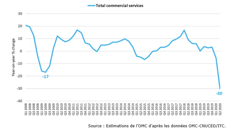 A l’image du tourisme international, le commerce des services a enregistré un fort recul. Les mesures de confinement et les restrictions en matière de voyages entraînant à la fois un choc d’offre et de demande. De plus, lorsque les usines sont à l'arrêt ou mobilisent faiblement leur capacité de production dans de nombreux pays, les services fournis aux industries manufacturières (construction, services d’architecture et d’ingénierie, etc.) s’effondrent. Notons que les échanges de services informatiques ont enregistré une augmentation avec la demande croissante de services numériques (plateformes, télétravail).