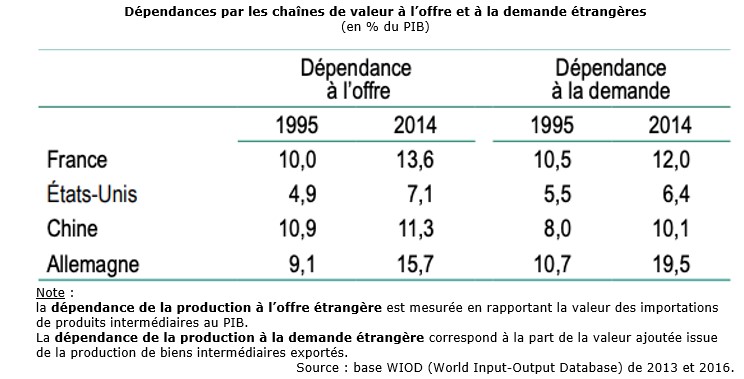 Selon la World Input-Output Database base (WIOD), pour la France, les importations de produits intermédiaires représentaient 13,6% du PIB en 2014, contre 10% en 1995.