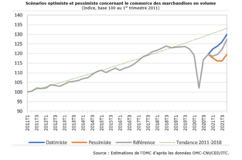 L’OMC présente plusieurs trajectoires possibles du commerce international qui oppose un scénario optimiste (deuxièmes vagues de COVID-19 mieux gérées, confinements plus limités) qui entraîne un retour rapide à la tendance antérieure à la pandémie et un scenario pessimiste qui implique un écart durable à la tendance des années passées compte tenu de l’endettement des États, de la hausse des taux de chômage, d’une faible disponibilité des vaccins, etc.