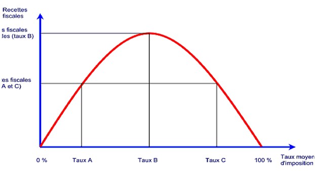 Par ailleurs, les économistes se sont beaucoup intéressés aux distorsions créées par la taxation des hauts revenu du travail. Le problème généralement mis en avant est une modification des choix des agents économiques en termes d’offre de travail. En réduisant leur revenu, la fiscalité les désincite à l’effort et les conduit à réduire leur offre de travail. L’introduction de l’impôt risque alors de conduire à une moindre activité au niveau de l’économie globale. On reconnaît ici le raisonnement d’Arthur Laffer, économiste qui a eu une certaine influence sur les politiques mises en place dans les années 1970-1980, lors du « tournant libéral » qui a remis en cause la progressivité de l’impôt (voir I.a.). La courbe de Laffer, que l’économiste aurait dessiné lors d’un dîner en 1974, montre qu’en réduisant la pression fiscale, il serait paradoxalement possible d’augmenter les recettes fiscales. La perte de recette liée à une baisse du taux d’imposition serait plus que compensée par la hausse des recettes liées à la hausse de l’activité économique globale. La logique de cette courbe repose sur le mécanisme évoqué plus haut en termes d’incitation au travail. Une faible fiscalité inciterait les agents économiques à offrir davantage de travail, alors qu’une forte fiscalité aurait un effet désincitatif. Autrement dit, « trop d’impôt tue l’impôt ». L’impôt sur le revenu étant, comme on l’a vu dans le I.a., progressif, ces effets désincitatif joueraient surtout sur les ménages aux revenus les plus importants. Il s’agirait donc de cibler en particulier ces ménages en réduisant les taux marginaux d’imposition les plus élevés. Voici une représentation de la courbe de Laffer :