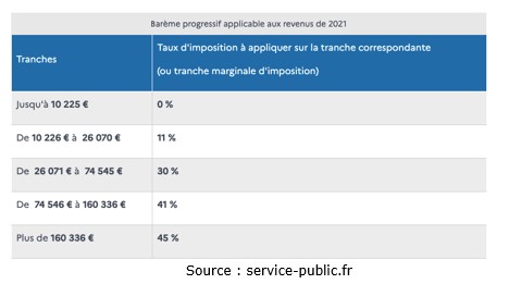 La première manière pour l’Etat d’intervenir sur inégalités de revenus et de patrimoine consiste à utiliser le système socio-fiscal, pour réaliser une redistribution verticale (à distinguer de la redistribution horizontale, que nous aborderons dans le I.b). Par ce biais, les pouvoirs publics interviennent sur les niveaux de revenus primaires des ménages en effectuant des transferts depuis les plus hauts revenus vers les plus bas revenus. Cette intervention débouche sur une répartition secondaire des revenus plus égalitaire. La différence entre la répartition primaire et la répartition secondaire des revenus détermine l’effet redistributif des transferts effectués. L’Etat agit donc sur deux leviers : il prélève d’un côté et redistribue de l’autre. Au sein des prélèvements obligatoires, désignant l’ensemble des prélèvements effectués par les administrations publiques, certains sont assis sur les revenus. L’impôt sur le revenu (IR) est celui qui contribue le plus à la redistribution verticale. Il a été créé en 1914. C’est un impôt qui est fixé au niveau du foyer fiscal, dépendant de la composition du ménage (par exemple, un célibataire compte pour une part de foyer fiscal, un couple correspond à deux parts, les deux premiers enfants ou personnes à charge ajoutent 0,5 parts, la troisième et la suivante ajoute une part). Il porte sur l’ensemble des revenus du capital et du travail (revenus financiers, loyers perçus, salaires, etc.) des individus composant le foyer fiscal. C’est en impôt progressif, car son montant dépend d’un barème défini par des taux marginaux de taxation associés à différentes tranches de revenu. Le revenu imposable est réparti dans les différentes tranches, chacune ayant un taux d'imposition différent. Voici le barème progressif entré en vigueur en 2022 applicable aux revenus de 2021 :