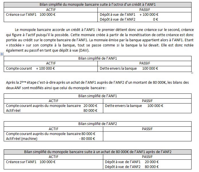Au niveau du bilan du monopole bancaire et des ANF impliqués dans le crédit accordé, cela se traduit par un certain nombre d’écritures :