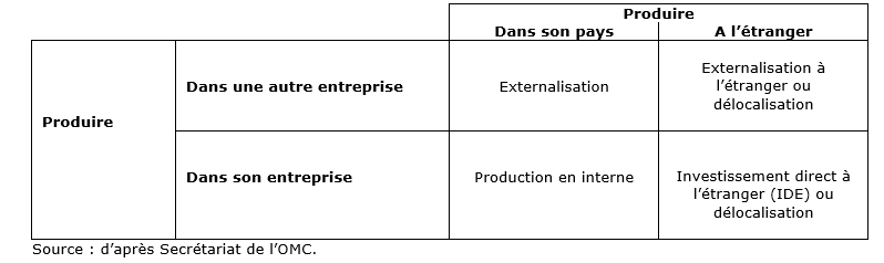 L’entreprise peut donc choisir de « faire » ou « faire faire », en France ou à l’étranger. Notons qu’ici, l’externalisation à l’étranger est un cas particulier de délocalisation.