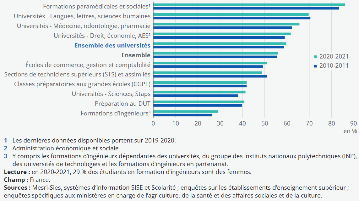 Dans l’enseignement supérieur, 56 % des étudiants sont des femmes. Le taux de scolarisation des femmes est supérieur à celui des hommes quel que soit l’âge avec un taux maximal atteint à 19 ans où 62 % des femmes d’une même génération sont inscrites dans le supérieur contre 51 % des hommes. Il y a moins de femmes dans les filières sélectives et scientifiques sauf dans la santé. Elles ne représentent que 29% des étudiants dans les écoles d’ingénieurs alors qu’elles pèsent 86% dans les formations paramédicales et sociales. Cet écart entre les disciplines scientifiques et formations sélectives entre femmes et hommes est resté constant sur la dernière décennie tout comme dans les études universitaires les plus longues. 46,7 % des doctorants sont ainsi des femmes mais elles ne représentent que 23 % des doctorants en maths et 30 % en science de l’ingénieur contre 55 % en sciences humaines et sociales et 58 % en biologie et médecine.