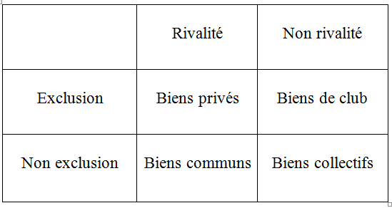 Bien commun : un bien commun est, à la différence d'un bien collectif, rival mais non excluable. L'utilisation par un individu supplémentaire d'une ressource commune a un coût social et empêche la consommation d'autres individus. Pourtant, il est difficile de limiter l'accès à ces ressources communes.