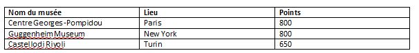 Le tableau ci-dessus donne des exemples de la notation de musée utilisée par le classement Kunst Kompass en 2005.