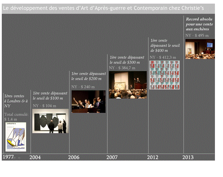C'est donc en 1977 à Londres et à New York que Christie's organise pour la première fois de son histoire des ventes dont le catalogue est exclusivement consacré à l’art contemporain, ces deux ventes cumulant un produit de 1,4 million de dollars. A New York en 2013, Christie’s bat par deux fois le record pour une vente d’art contemporain, en totalisant successivement 495 millions de dollars en mai puis 691 millions en novembre... Ces chiffres peuvent laisser rêveur, ou donner le tournis.