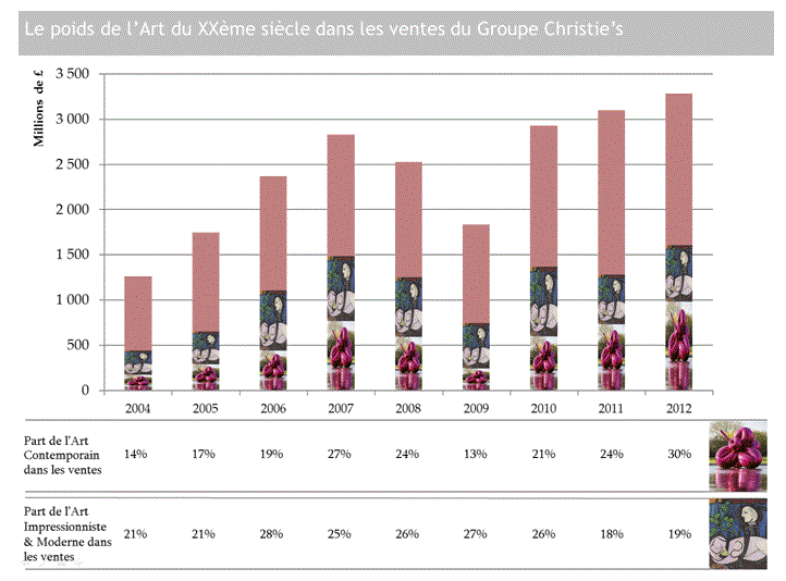 En 2004, pour la première fois, une vente d’art contemporain dépassait les 100 millions de dollars. Une réelle euphorie s’empare alors d’un marché que rien ne semble pouvoir arrêter. Chaque saison, les ventes sont rythmées par des records successifs, jusqu’à dépasser un total vendu de 300 millions de dollars en mai 2007. Résultat de cette course effrénée : cette même année - ce qui ne s'était jamais vu dans l'histoire de Christie's - le département d'Art Contemporain dépasse en chiffres celui de l'Art Impressionniste et Moderne et devient le premier contributeur aux résultats du groupe.