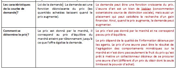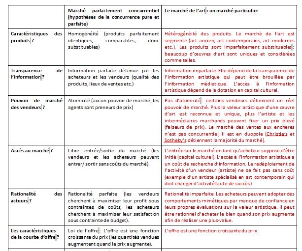 Exercice 1 : Le marché de l’art est-il un marché parfaitement concurrentiel ? Compléter la colonne relative au marché de l’art pour montrer en quoi le marché est relativement éloigné d’un marché parfaitement concurrentiel.