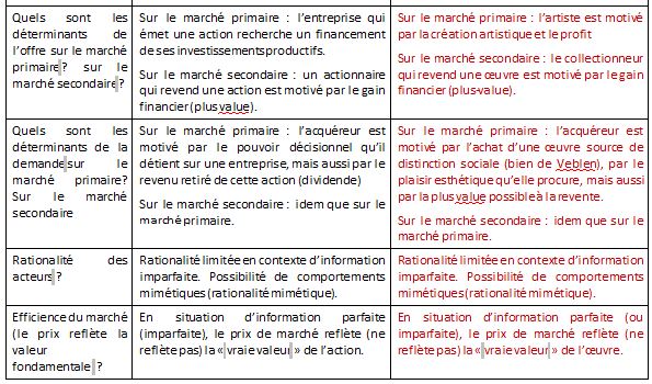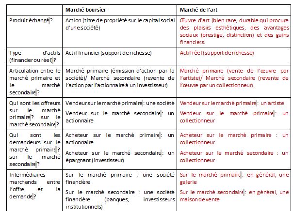 Exercice 2 : Le marché de l’art est-il si différent des autres marchés ? Dans les faits, le marché de l’art est un marché potentiellement spéculatif. Sans pour autant être totalement identique, son mode de fonctionnement se rapproche de celui du marché boursier. Compléter le tableau ci-dessous.