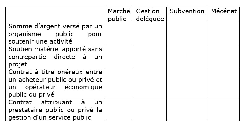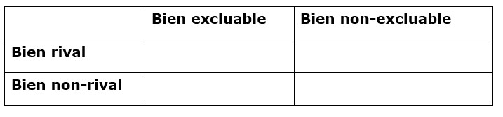 2) Compléter le tableau ci-dessous en plaçant les termes suivants : bien privé, bien de club, bien collectif et bien commun
