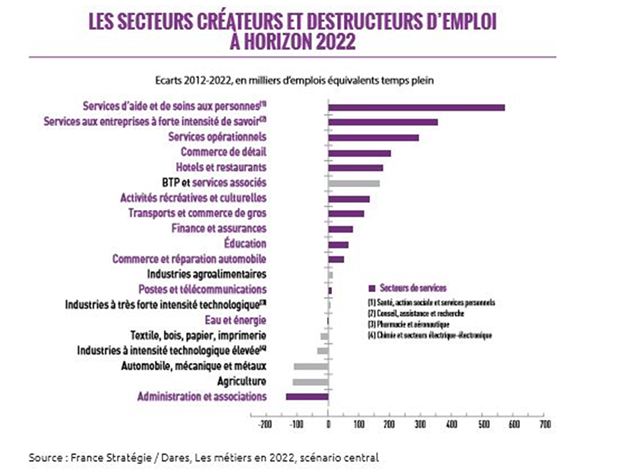 Contrairement aux idées reçues, les services ne sont pas des « petits boulots » à l’abri de la concurrence internationale. Comme les emplois industriels, bon nombre d’entre eux sont « délocalisables » car la concurrence est devenue une réalité internationale dans le domaine des services (c’est particulièrement vrai pour le conseil, l’informatique, les activités de back-office, les centres de relation client). On estime qu’environ la moitié des emplois tertiaires sont menacés. Par ailleurs, ces services ne sont pas essentiellement des emplois à faible valeur ajoutée et à faible rémunération. Quand on regarde les métiers en tension dans un avenir proche (voir graphique ci-dessous), on trouve aussi bien des métiers à faible qualification (comme les services d’aide et de soins aux personnes) que des métiers à forte qualification (comme les services aux entreprises à forte intensité de savoir).
