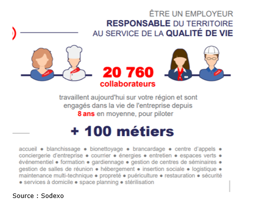 A travers son ancrage en Île-de-France, on constate que Sodexo couvre une palette de services aux ménages : services à domicile, restauration, propreté, etc. Mais Sodexo produit aussi des services aux entreprises : gardiennage, gestion de centres de séminaires, évènementiel, centres d’appels, etc.