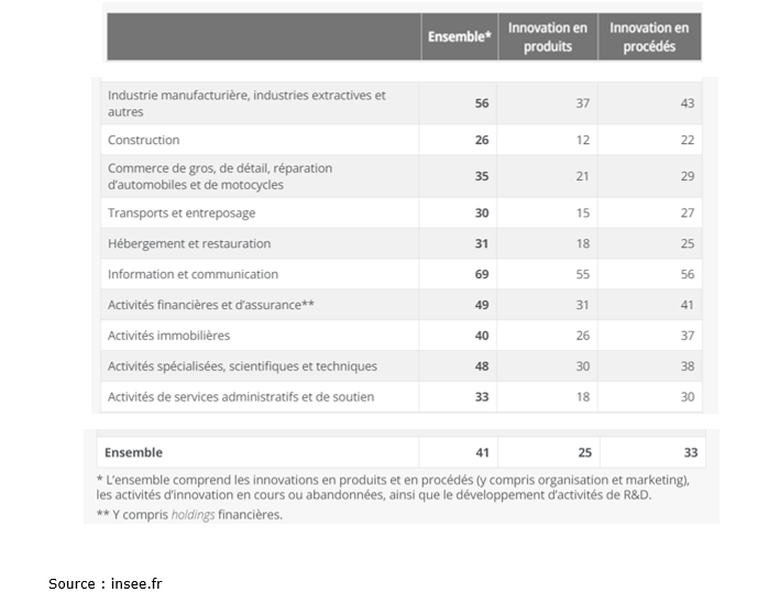 On considère traditionnellement (cf document 1 du point 5- Vers une société de services ?) les services comme des activités peu susceptibles de générer des gains de productivité du fait de leur nature. Or, on mesure aujourd’hui à quel point les services sont aussi au cœur des innovations de produit (des services nouveaux ont émergé ces dernières années) et de procédés : des méthodes, des processus nouveaux sont mis en place dans le cadre des services (les plateformes par exemple). Le document de l’Insee montre que la proportion d’entreprises qui innovent est très forte dans certains types de services (communication par exemple).