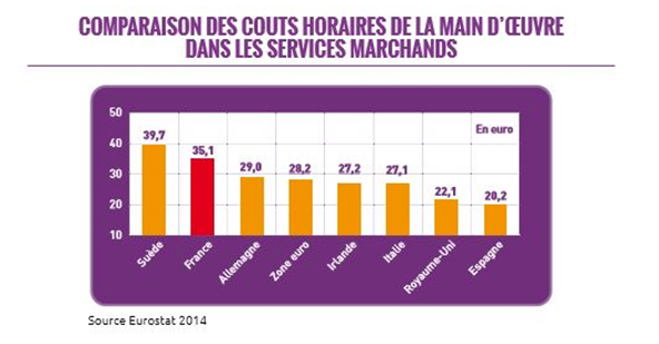 Au niveau de la compétitivité-prix, les entreprises de service sont particulièrement sensibles à l’ensemble des charges pesant sur le coût du travail, notamment aux taxes assises sur les salaires ou sur la valeur ajoutée. Le niveau élevé de ces charges fait que les coûts horaires de la main-d’œuvre sont particulièrement élevés en France par rapport à ses voisins européens. Comme on peut le voir ci-dessous, la France a un coût horaire de main-d’œuvre dans les services marchands situé à 35,1 euros, plus que l’Allemagne (29 euros), et bien plus que des pays voisins comme le Royaume-Uni (22,1 euros) ou l’Espagne (20,2 euros).