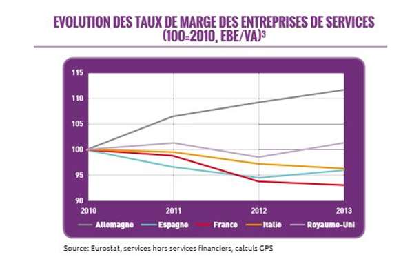 En matière de compétitivité structurelle ou hors-prix, les entreprises françaises de service ont des difficultés pour faire reconnaître leur innovation et leur valeur ajoutée. Comme le met en relief le projet de Pactes Services publié par le Groupement des professions de service (GPS), les services sont encore trop souvent considérés comme devant contribuer à la seule compétitivité-prix des autres secteurs, comme des « instruments » dont le prix devrait être le plus bas possible. Cette conception des services est en contradiction avec leur véritable nature qui repose sur des attentes fortes des clients en matière de qualité des prestations, d’immédiateté, de personnalisation et d’efficacité. On ne vend plus seulement un produit, mais également le service qui l’accompagne. En tout cas, la vision quelque peu surannée des services en France fait que les prestations de ce secteur ne sont pas reconnues à leur juste valeur. Dans ces conditions, beaucoup d’entreprises françaises sont conduites à infléchir leur taux de marge, ce que l’on ne retrouve qu’à un moindre degré dans les autres pays développés.