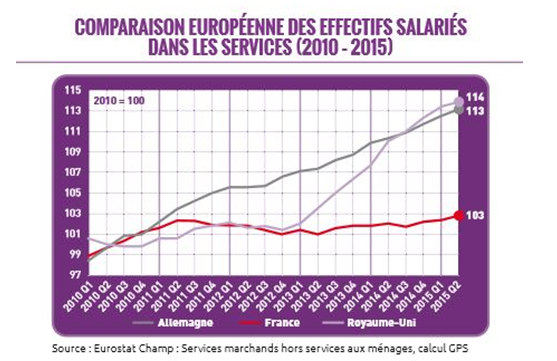 Avec une compétitivité-prix et hors-prix réduite, la France peine actuellement à retrouver le chemin d’une croissance soutenue dans les services. Ceci est très net quand on se penche sur l’évolution de notre pays par rapport à l’Allemagne et au Royaume-Uni en matière de croissance des effectifs dans les services. La France stagne là où nos deux voisins progressent.