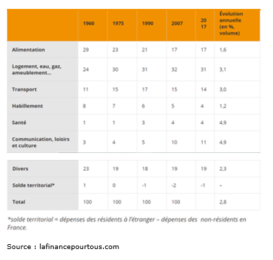 Deux postes ont pris une place importante dans le budget des ménages. D’une part, le logement est devenu le premier poste de dépense. Son coefficient budgétaire est passé de 24 % en 1960 à 31 % en 2017. D’autre part, le transport pèse aujourd’hui plus lourdement sur le revenu des ménages : de 11 % des dépenses des ménages en 1960, les coûts de transport sont passés à 14 % en 2017. Dans le même temps, le poids relatif des dépenses en services dans le budget des ménages a explosé dès la fin des années 1950 : la part des dépenses de communication, de loisirs et de culture a augmenté de 4,9 % par an en moyenne de 1950 à 2017. Quant au poste santé, sa part a été multipliée par 4.