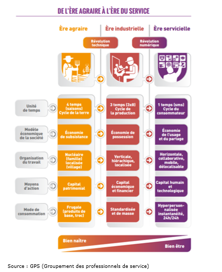 La « société de services » remplace peu à peu le monde industriel. Ce phénomène majeur avait déjà été anticipé en 1948 par Jean Fourastié. Dans Le grand espoir du XXème siècle, livre au titre évocateur, il affirmait que l’homme avait travaillé la terre pendant des millénaires, puis la matière pendant des siècles, et qu’il allait maintenant travailler l’homme lui-même. Le grand espoir décrit par Fourastié est que l’homme va enfin s’humaniser dans les relations de service, ce qui signifie la fin de l’aliénation, avec comme contrepartie négative le fait que cette économie engendre aussi une croissance ralentie : puisque les gains de productivité sont moindres ou inexistants dans les activités de service, la croissance est par définition bornée.