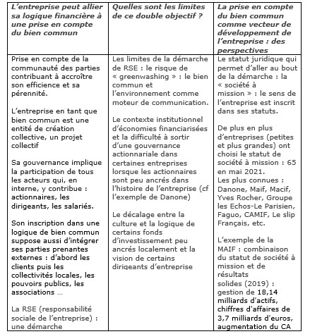 (…) Les représentations de l'entreprise comme acteur de l'intérêt général et institution primaire de l'économie de marché se développent dans l'espace public de la Cité et ouvrent de nouvelles perspectives politiques en matière de démocratie industrielle. […] L'on a très souvent pu lire dans la presse soit que l'entreprise est un bien commun, soit qu'elle sert le bien commun. (…) Un bien commun au service du bien commun ? Cette réponse est peu satisfaisante d'un point de vue logique. (…) les travaux de deux économistes, Elinor Ostrom et Oliver Williamson, lauréats du Prix Nobel d'économie 2009, peuvent éclairer les termes du débat actuel. (…)