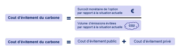 Le coût d’évitement du carbone est un rapport. Il se calcule en mettant au numérateur le surcoût que la société envisage de payer pour mettre en œuvre les différentes solutions pour décarboner l’économie (coûts privés supportés par les ménages et les entreprises, et coûts supportés par le secteur public) et au dénominateur la performance réalisée par ces différentes solutions en matière de réduction des émissions de GES. L’idée est de privilégier les solutions qui mobilisent au minimum les fonds publics et privés pour un maximum de tonnes de tonnes de CO2 évitées.