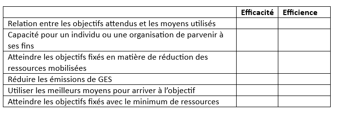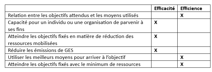 - Efficience : L’efficience se rapporte à la relation entre les objectifs attendus de l’action et les moyens mobilisés pour y parvenir. Être efficient, c’est atteindre les objectifs fixés en utilisant le minimum de ressources, donc utiliser les « meilleurs moyens » pour arriver à la fin poursuivie. La différence entre efficacité et efficience réside donc dans la relation moyens-fins. Une politique efficiente de décarbonation met en rapport le coût attendu de cette politique avec la réduction d’émission de CO2 espérée.