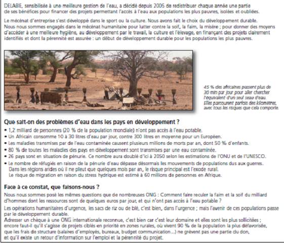 Il faut déjà savoir que la robinetterie est une branche de la métallurgie qui peut se diviser en plusieurs parties. Delabie est spécialisée dans la fabrication de robinetterie et accessoires sanitaires pour établissements recevant du public. Cette spécificité n'est pas anodine dans la mesure où c'est une profession très règlementée et où les solutions apportées sont souvent à la base des évolutions concernant l'habitat individuel. Delabie s'est fixée pour mission de satisfaire les besoins en économie d’eau, en hygiène et confort sanitaire, en développant des solutions techniques innovantes et des produits spécifiques à chaque usage, en contribuant au développement durable. C'est pour donner sens à ce dernier aspect qu'elle a par ailleurs développé une action humanitaire (« Mécénat humanitaire : de l'eau pour la vie »).