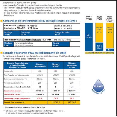 Notons enfin que les mitigeurs Delabie garantissent une sérieuse économie d'eau, entre 60 et 90%, selon les types par rapport à une robinetterie traditionnelle. Ceci constitue un atout appréciable dans un contexte de promotion du développement durable.