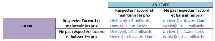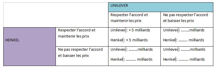 Pour simplifier notre analyse, nous ne prendrons que deux firmes : Unilever et Henkel en considérant qu’elles ont conclu un accord sur le prix de vente de leur lessive haut gamme (alignement des prix de la lessive Skip et Le Chat). Voici les différentes situations possibles :