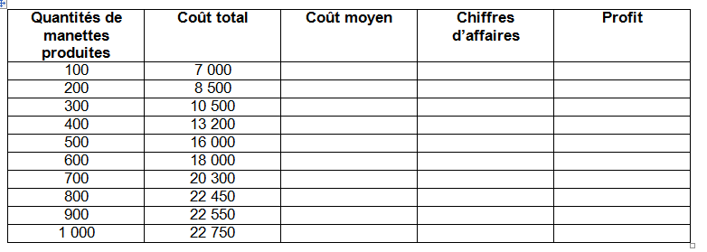 1. Calculez le coût moyen c’est-à-dire le coût pour 1 manette fabriquée.
